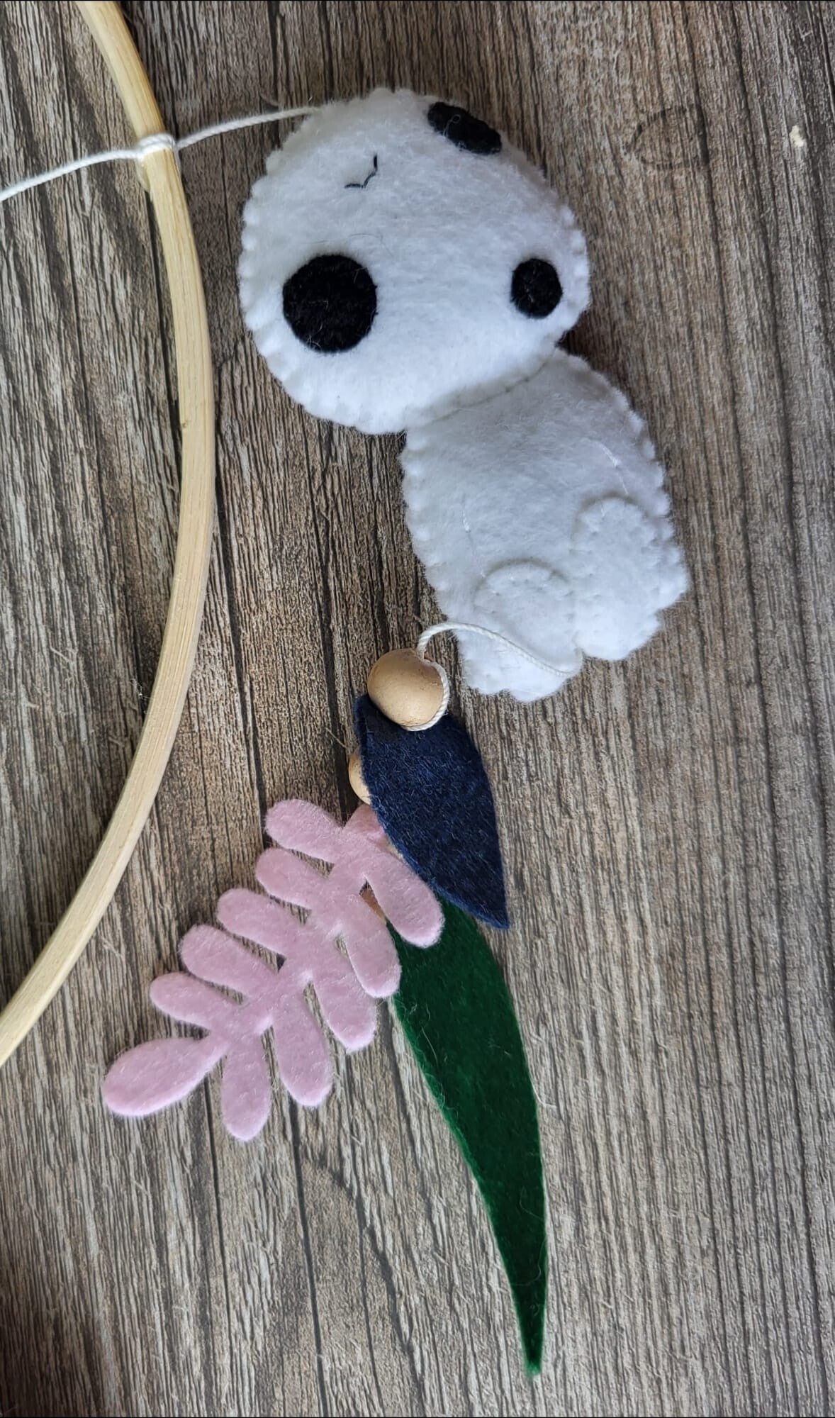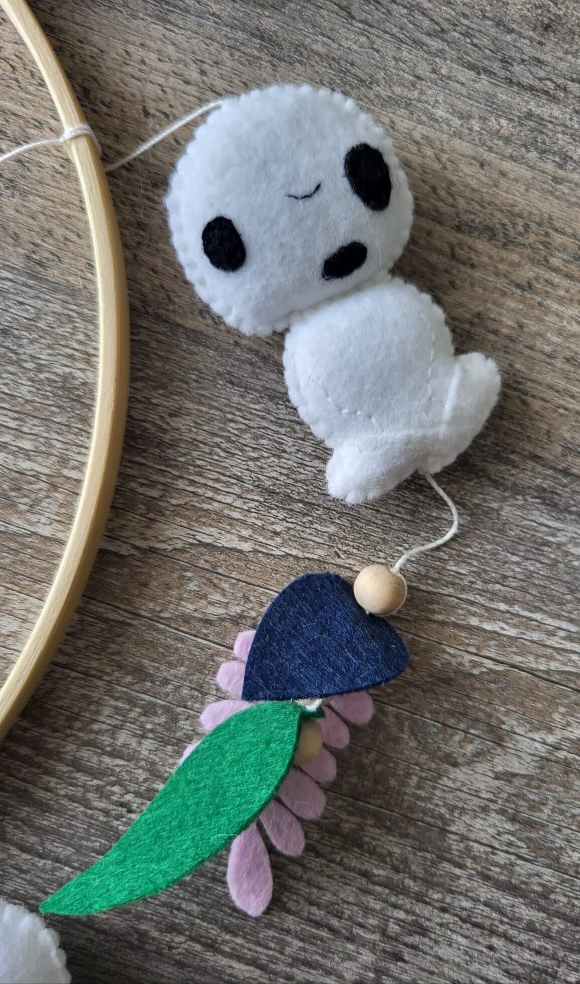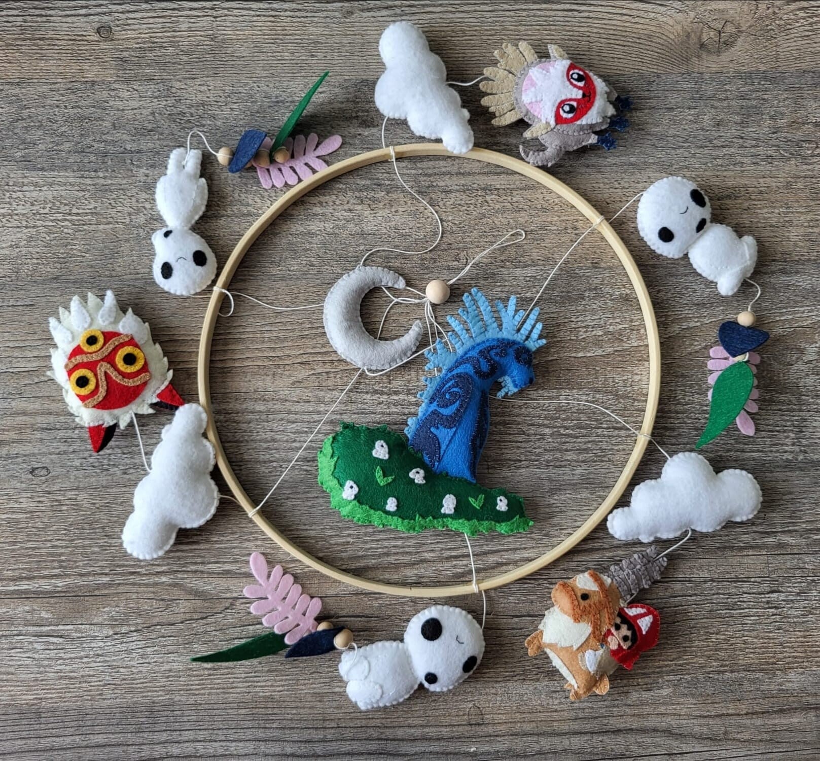 Suspendus autour de l'esprit de la forêt, les Kodama semblent flotter avec légèreté, comme s'ils dansaient dans la brise douce d'une nuit étoilée. Chaque Kodama est délicatement réalisé en feutrine, mettant en valeur leur texture moelleuse et leur aspect fantomatique. Les feuiles colorées soulignent leur lien avec la nature.