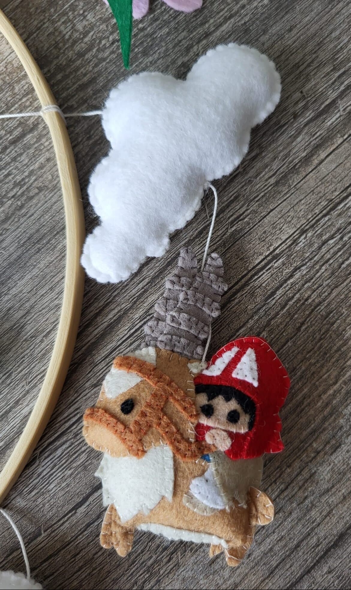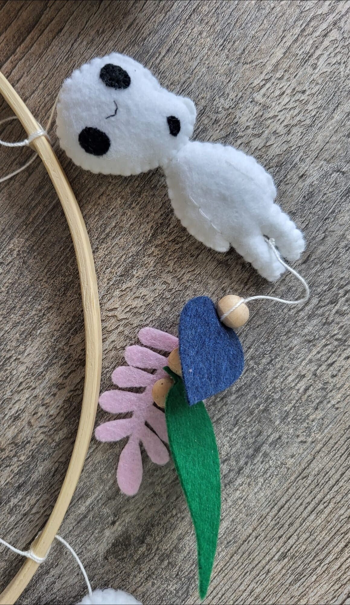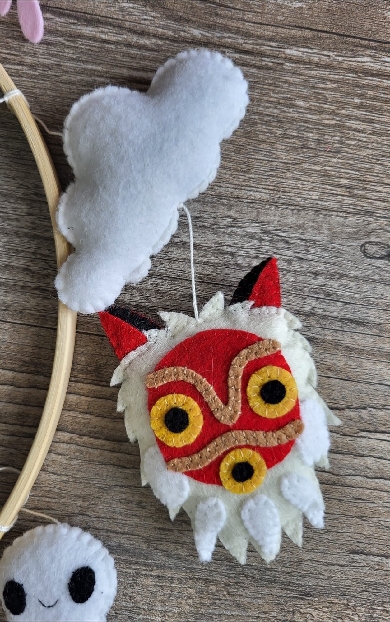 Suspendus autour de l'esprit de la forêt, les Kodama semblent flotter avec légèreté, comme s'ils dansaient dans la brise douce d'une nuit étoilée. Chaque Kodama est délicatement réalisé en feutrine, mettant en valeur leur texture moelleuse et leur aspect fantomatique. Les feuiles colorées soulignent leur lien avec la nature.
